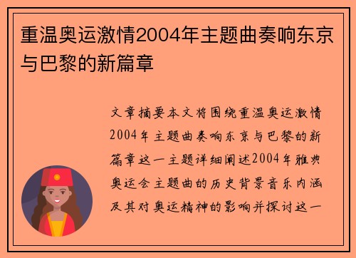 重温奥运激情2004年主题曲奏响东京与巴黎的新篇章
