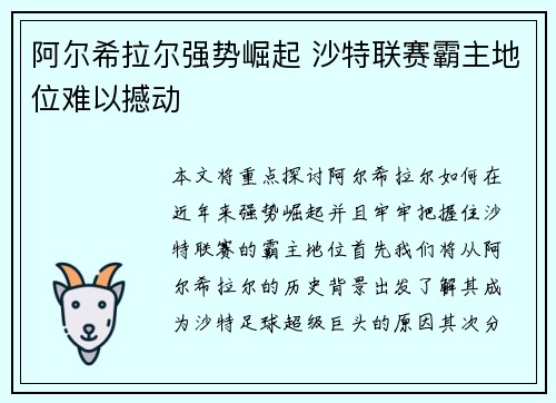 阿尔希拉尔强势崛起 沙特联赛霸主地位难以撼动